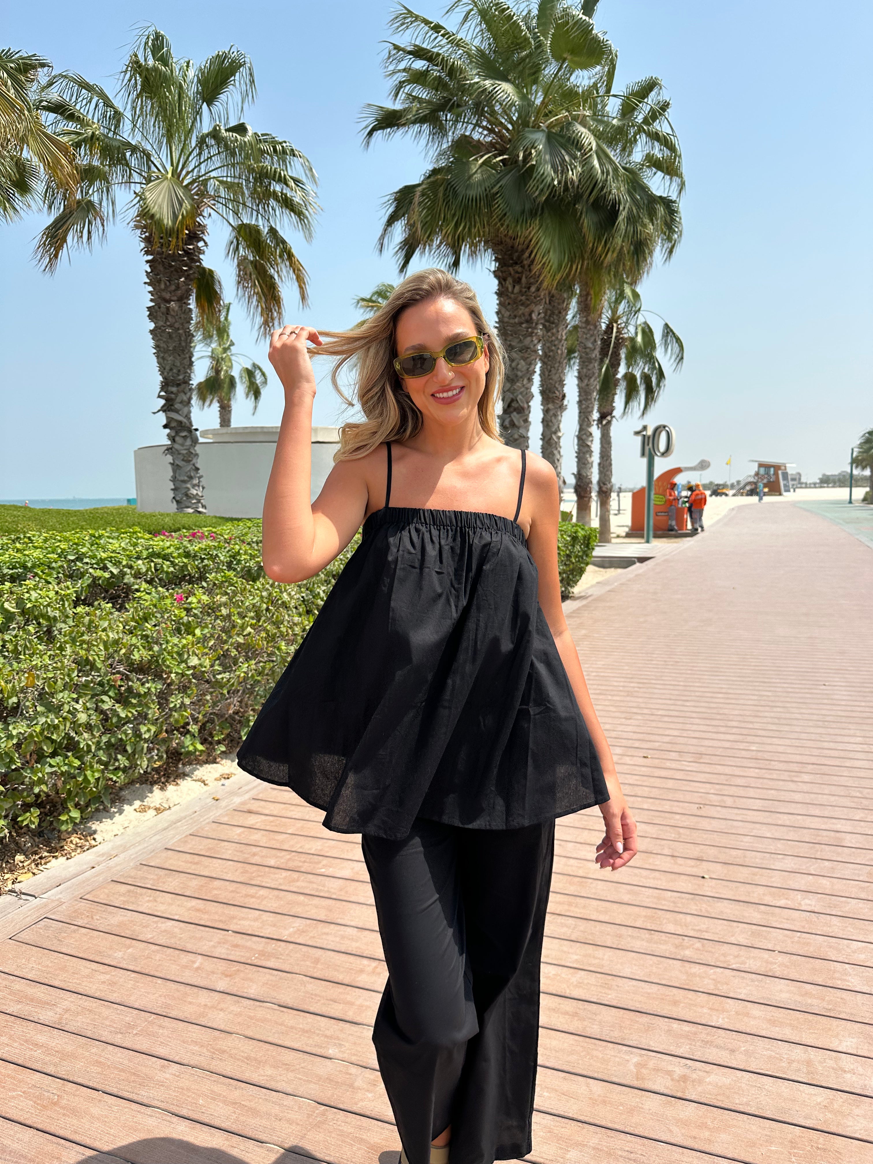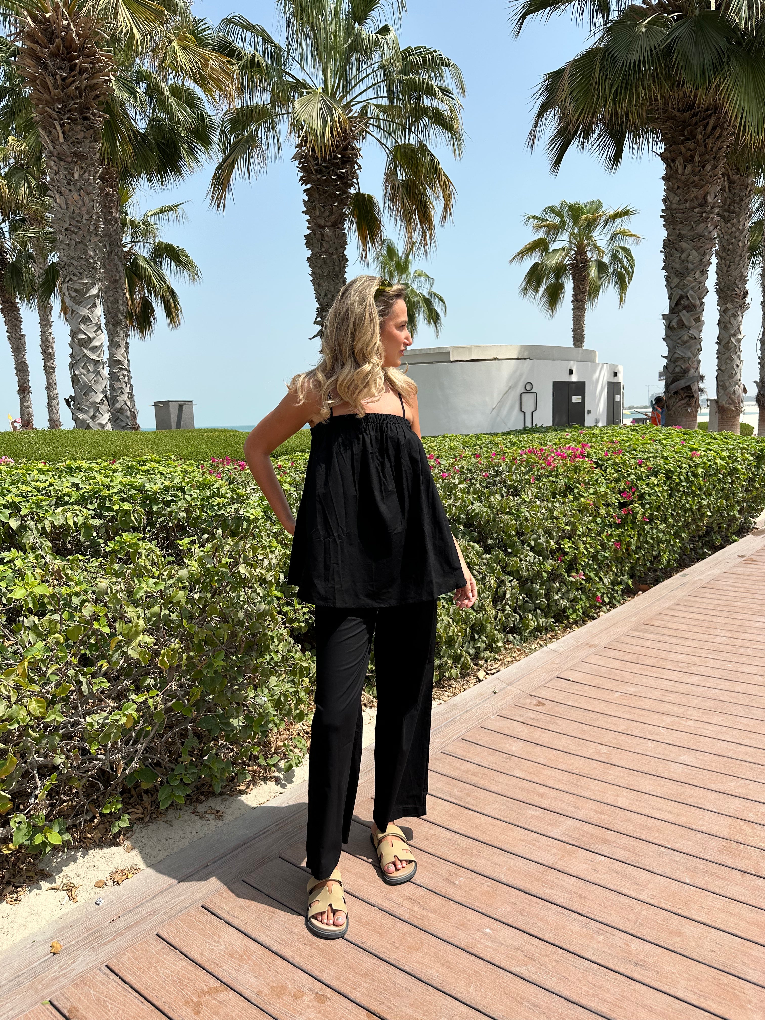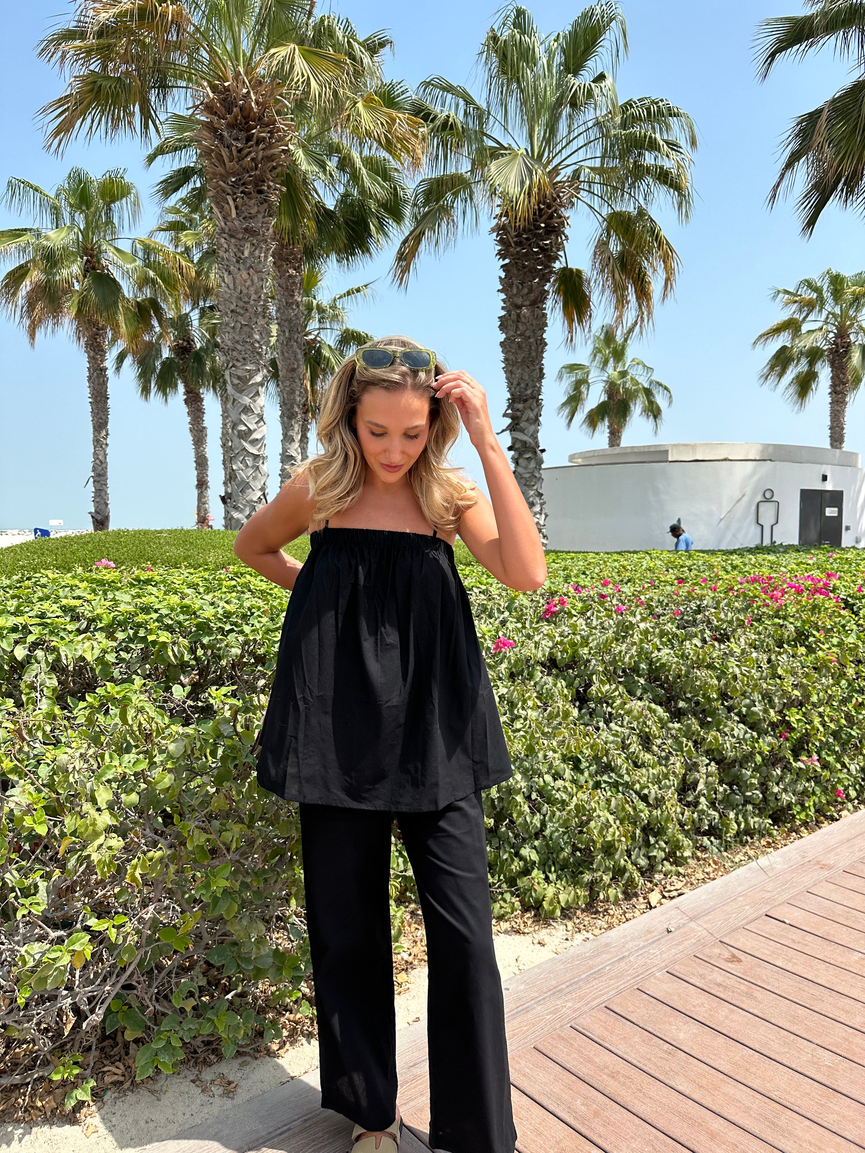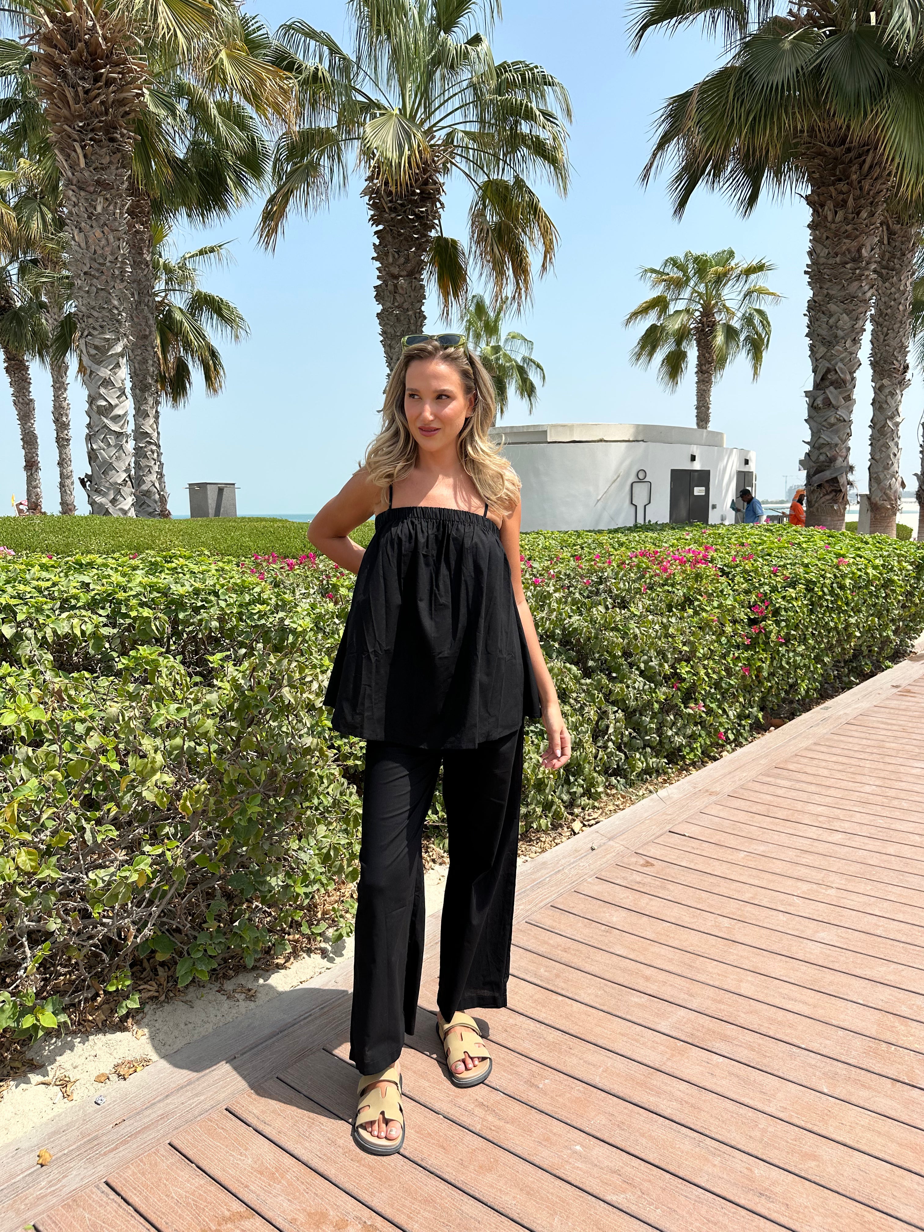 This two-piece set includes a relaxed wide-leg pant and a flowy camisole top.